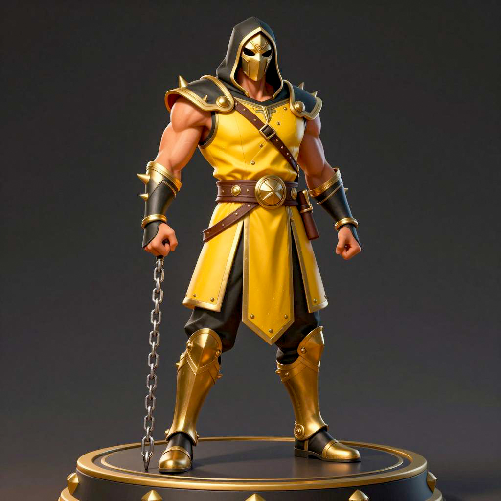 Muscular male ninja standing on blue ice crystal platform. Wearing black armor with blue icy accents, face mask, and hood. Dark background with floating orange embers. Hands clenched, feet apart. Blue ice crystals surrounding base. Digital illustration.