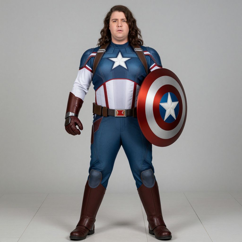 Plus Size Avengers Costume, dressed in armor standing on a tiled floor