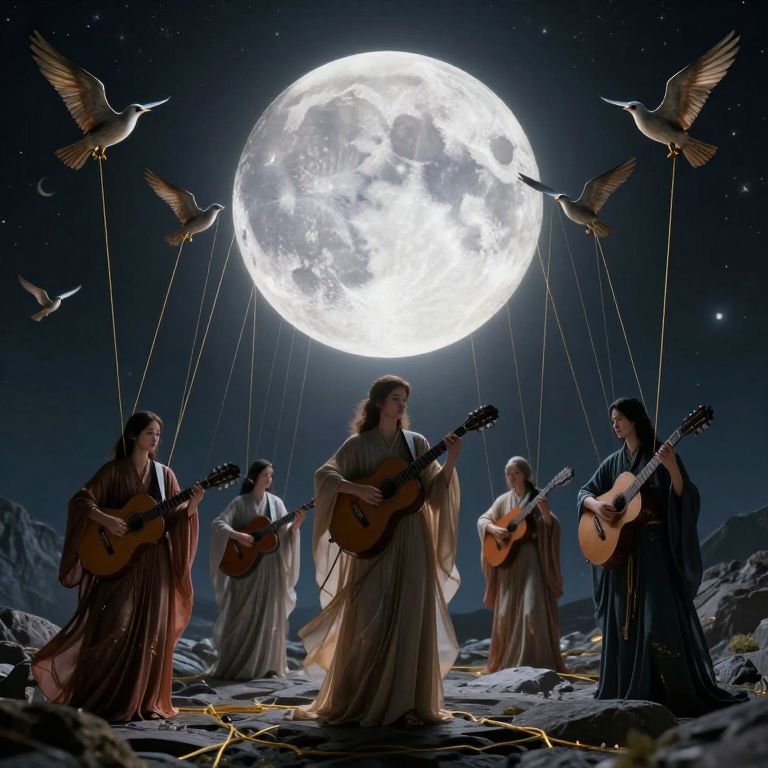 Celestial musicians in flowing robes stand on a rocky terrain, strumming guitars beneath a massive, luminous moon suspended by golden strings tied to soaring birds, creating a surreal, otherworldly scene with dramatic lighting and a fantastical, digital art aesthetic.