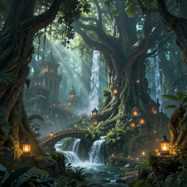 Realistic fantasy art featuring a serene elven city nestled in giant ancient trees, with glowing lanterns, waterfalls cascading, ethereal light beams piercing through the canopy, highly detailed foliage and architecture, enchanted ambiance