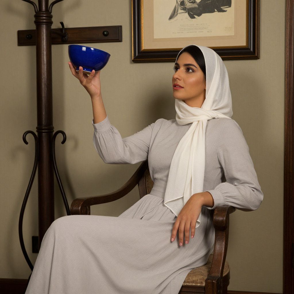Seated woman in a light gray dress, wearing a white headscarf tied in a bow, holds a vibrant blue ceramic bowl aloft in her right hand while resting her left arm on a wooden chair, set against a vintage interior backdrop featuring a coat rack, framed artwork, and muted wall tones.