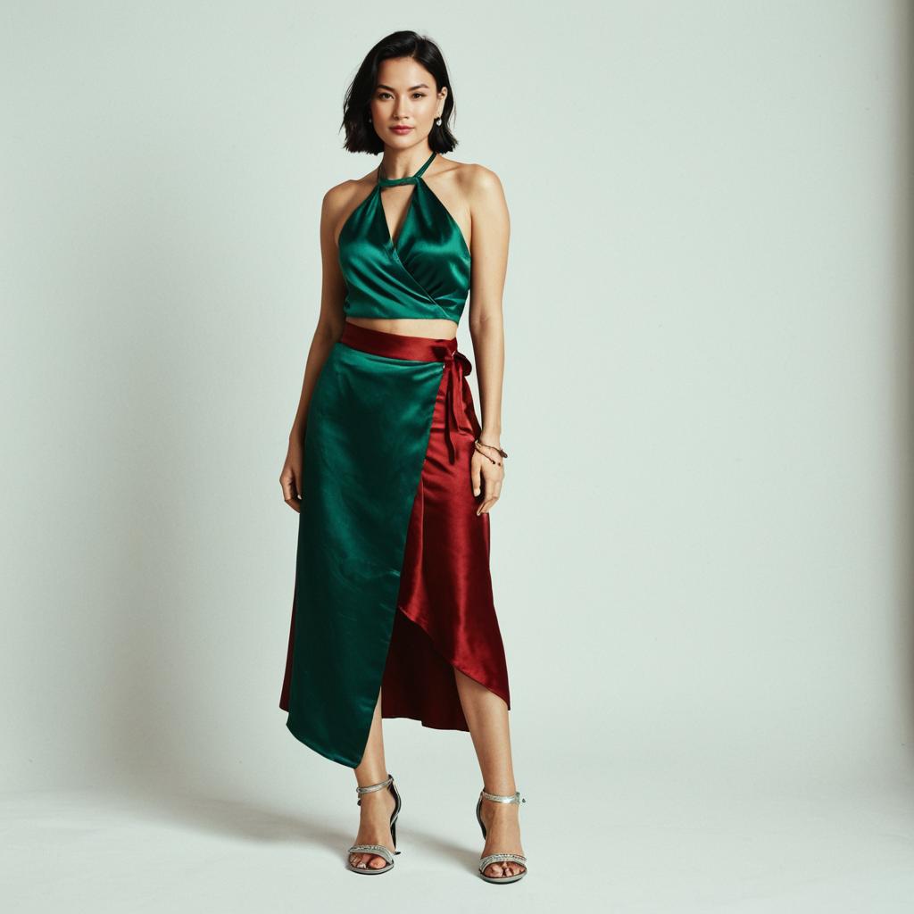 Woman, contemporary chic, satin halter neck top in emerald green, asymmetrical wrap skirt in deep red, Delicate silver anklet, nude block heel sandals, minimalist studio background.