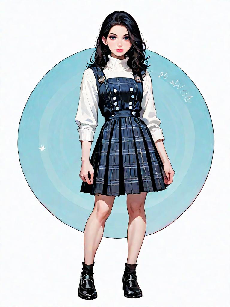 1girl, source_comics, realistic face, full body shot, Woman, preppy style, plaid pinafore dress in beige with black and white checks, square neckline, sleeveless, fitted waist with decorative buttons down the front, mini length, worn over a white long-sleeved turtleneck top, plain white background.