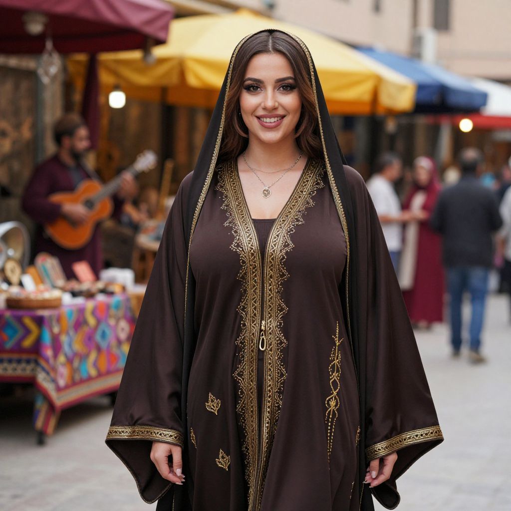 A bold and stylish young woman with sharp features, fair skin, and a confident smile wearing a dark brown abaya customized with gold thread designs and a flowing costume overlay resembling a desert warrior’s attire, standing in front of a traditional Moroccan souk during a festival, vibrant colors and music in the background.. The woman has big breasts and cute face