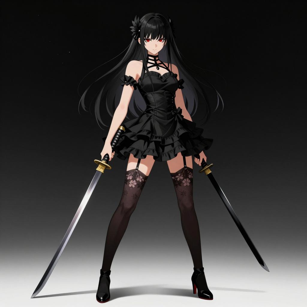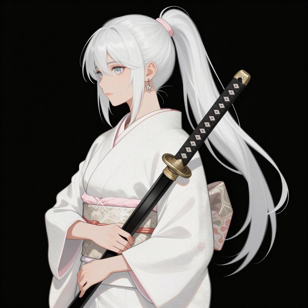 Digital illustration of a young woman in profile. She has long, black hair in a high ponytail, wearing a dark floral kimono with white collar. She holds a sword with a diamond-patterned hilt in her right hand. Her left hand is gloved. Her expression is serious. Background is dark. She has a black tattoo on the back of her neck.
