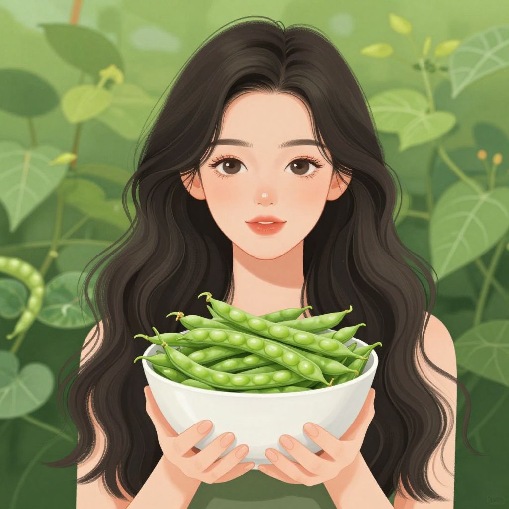 A vibrant digital illustration depicts a woman with long, wavy black hair, holding a bowl of fresh green runner beans, set against a lush, verdant background with a soft, high-definition rendering style.
