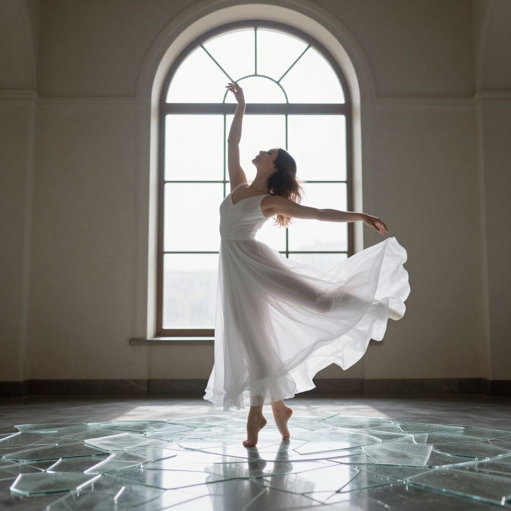 Woman gracefully dancing barefoot on shattered glass, illuminated by ethereal sunlight streaming through an arched window, as her flowing white dress billows around her in a serene, dreamlike scene.