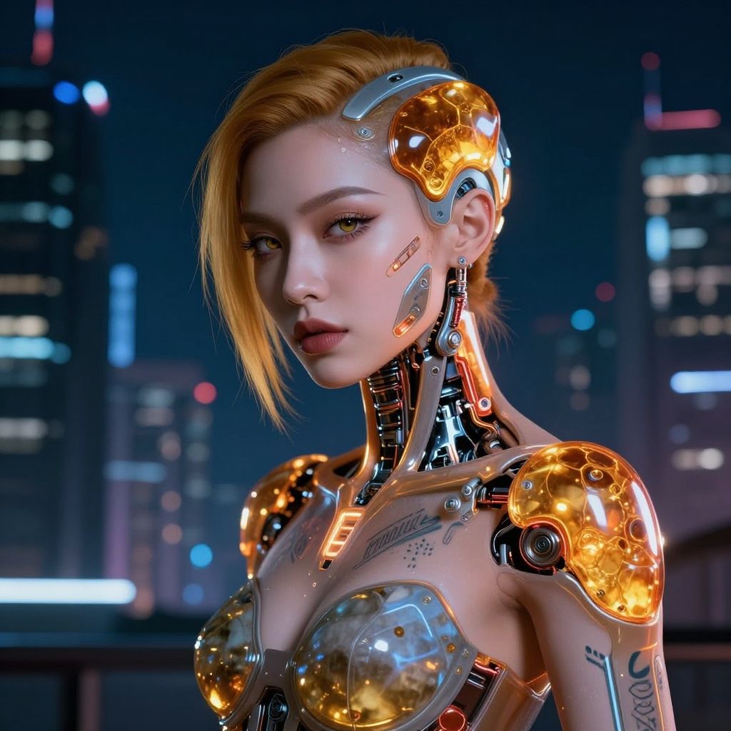 Amber official art, futuristic cyberpunk style portrait featuring a character with amber cybernetic implants and neon glowing tattoos, urban night cityscape in background