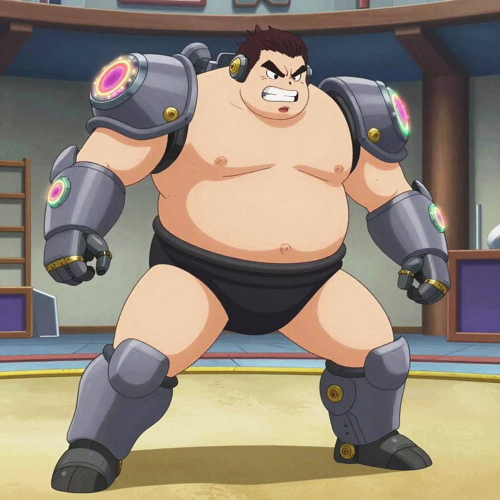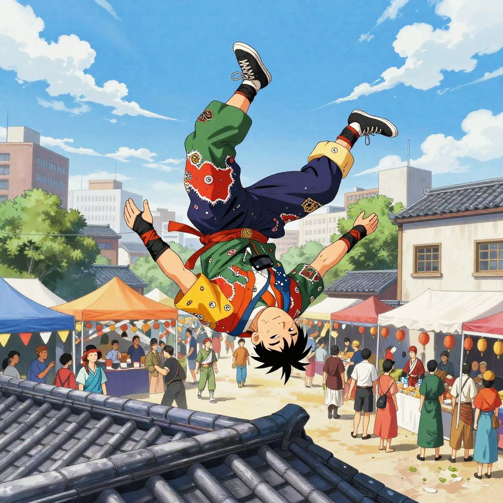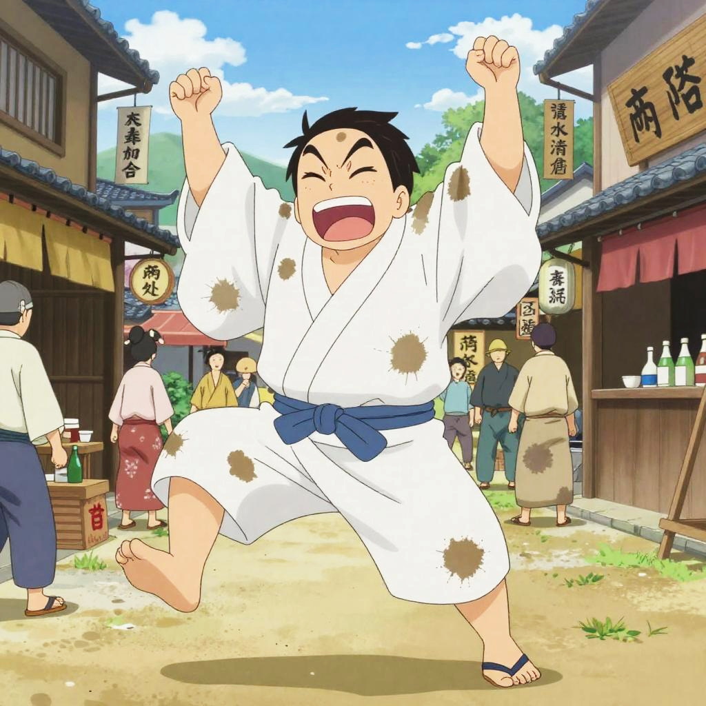 A jovial sake brewer spirit, wearing a loose festival happi coat covered in sake stains, engaged in celebrating with a comical drunken stumble, set in a rustic tavern near a bustling village square, illustrated in the humorous yet action-packed anime style of Hideaki Sorachi.