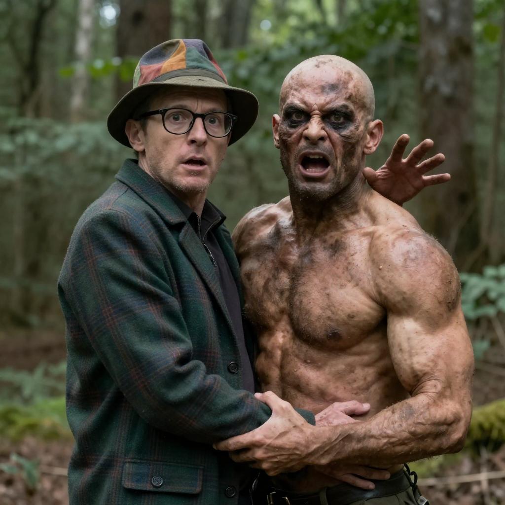 Photograph of two people in a forest. A bald, muscular man with a grotesque, mud-covered face and open mouth holds a man with glasses, a colorful hat, and a green plaid jacket. The second man's face shows shock. The bald man's left hand is raised. Background has green foliage and trees.