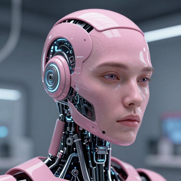 Pink guy face, futuristic robotic android with a sleek pink metallic exterior, illuminated circuits visible beneath semi-transparent skin, sci-fi laboratory environment, high contrast lighting, digital concept art with sharp focus