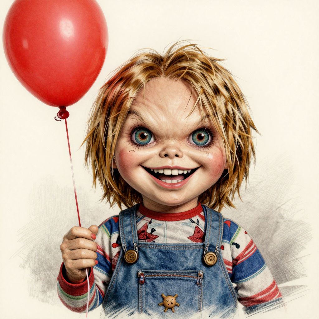 Surrealism grunge cartoon portrait sketch of chucky with a wide smile and a red balloon by - michael karcz, loony toons style, comic book style, horror theme, detailed, elegant, intricate