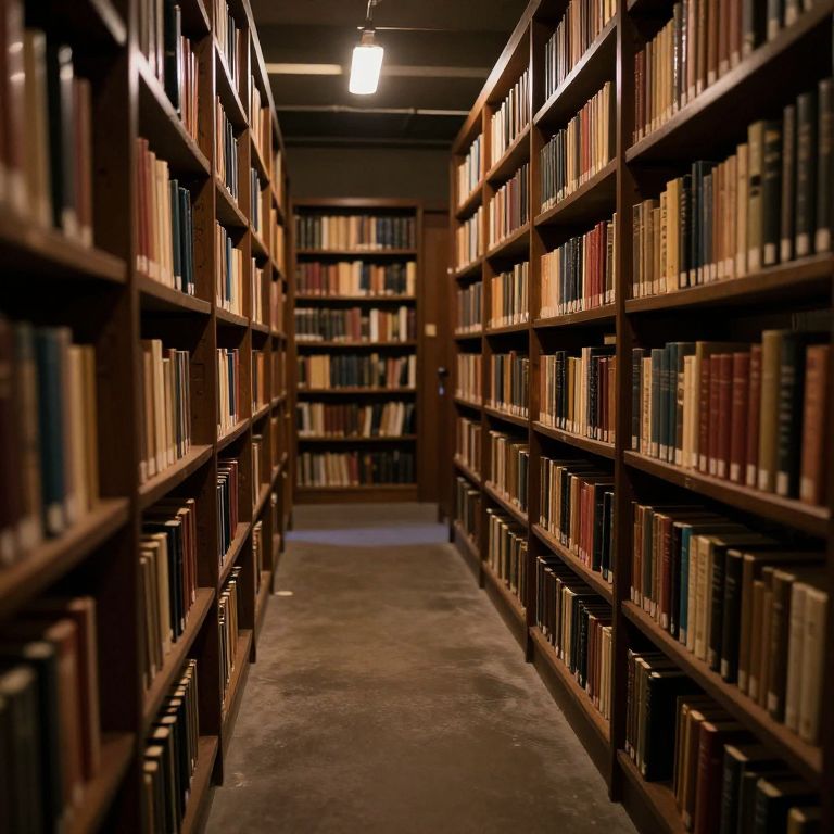 Photograph of a dimly lit library aisle with tall, wooden bookshelves on both sides, filled with neatly arranged books of various colors and sizes. The floor is concrete, and the ceiling has a single overhead light, casting a warm glow. The perspective creates a vanishing point at the end of the aisle, where another section of bookshelves is visible. The overall atmosphere is quiet and scholarly, with a sense of depth and order. The bookshelf tops and edges are polished wood, contrasting with the dark, worn floor.