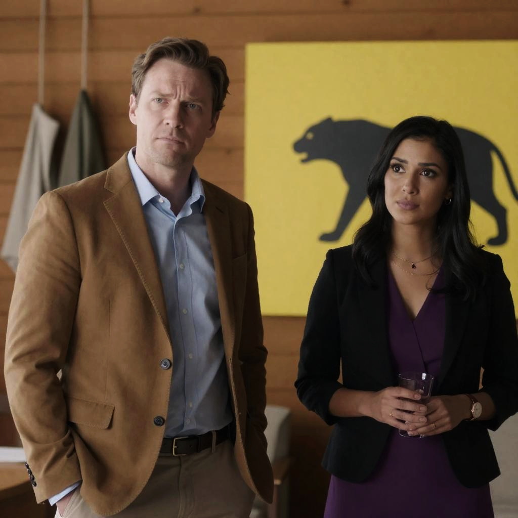 Photograph of three people in a laboratory. A woman with dark hair, wearing a leopard-print jacket and purple pants, stands left. A man with blond hair, in a white lab coat, holds a flashlight in the center. A woman with dark hair, in a red dress, stands right. Laboratory background with shelves, skeletons, and equipment. Man holds flashlight with intense focus. Women have neutral expressions.