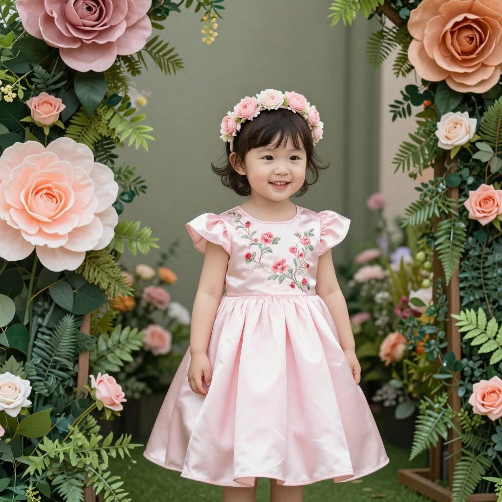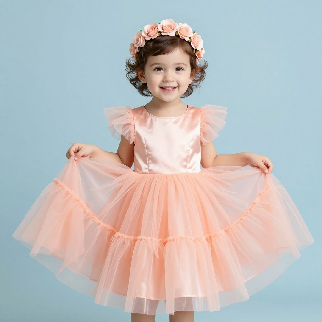 Portrait of a happy toddler girl wearing a fancy pink dress adorned with floral ruffles and a matching headband. She stands against a soft pink background, smiling and holding the sides of her dress.