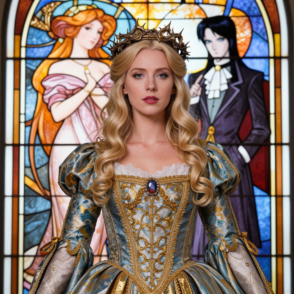 Photograph of a blonde woman with wavy hair, wearing an ornate, medieval-style gown with gold and silver embroidery and a jeweled bodice. She has a crown with intricate detailing on her head. Her dress features puffed sleeves and a corseted waist. The background is a stained glass window with vibrant colors, depicting a woman with orange hair and a man in a black suit with a white bow tie. The stained glass has a blue and orange color palette. The woman's expression is serene, and she stands centered in the image.