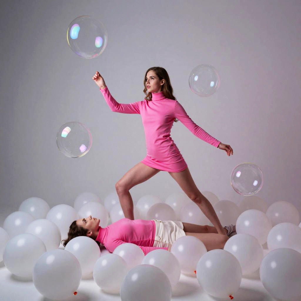 Photograph of two women in pink dresses dancing on white balloons, surrounded by floating transparent bubbles against a gray background.