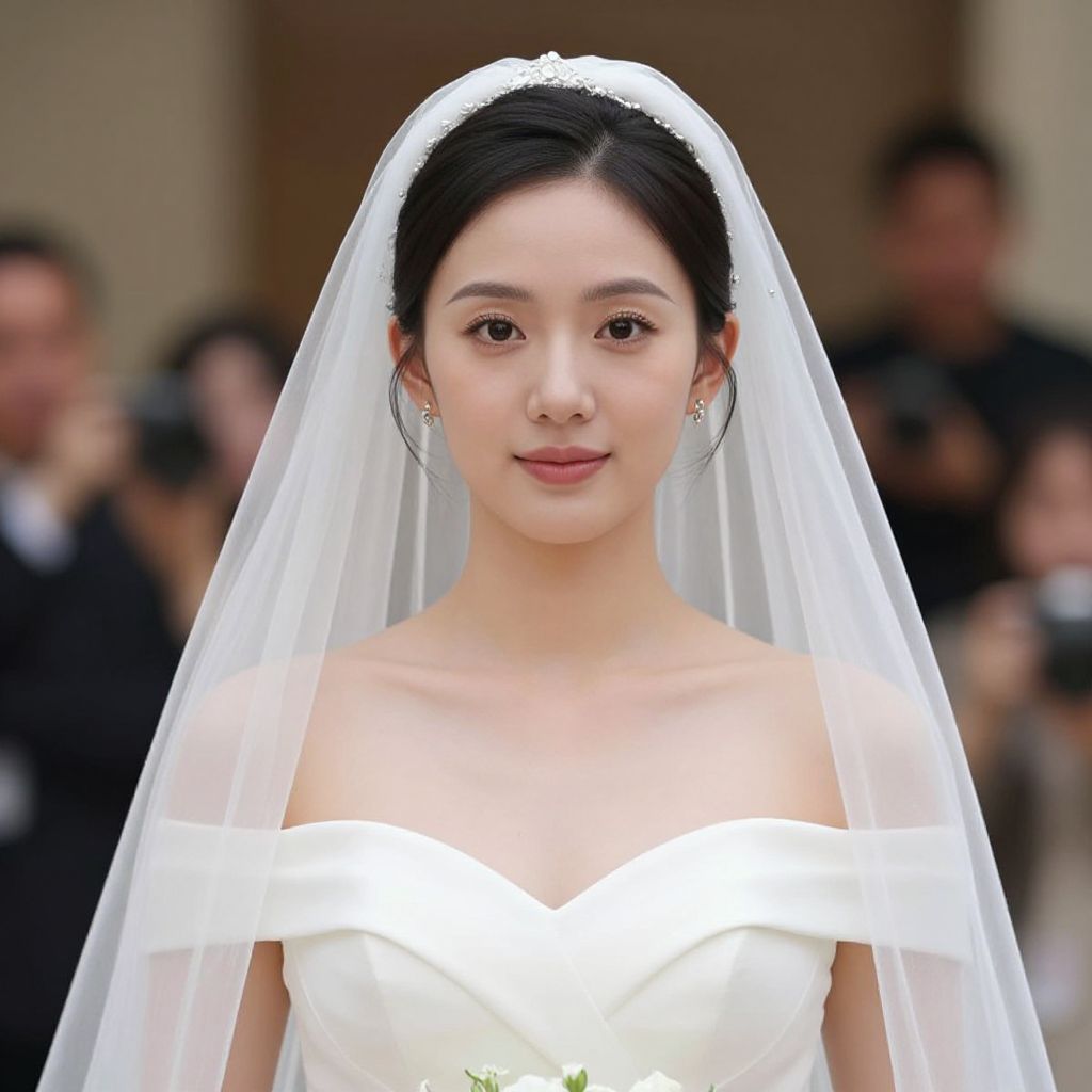 Female wearing a green and white dress with a veil on her head.