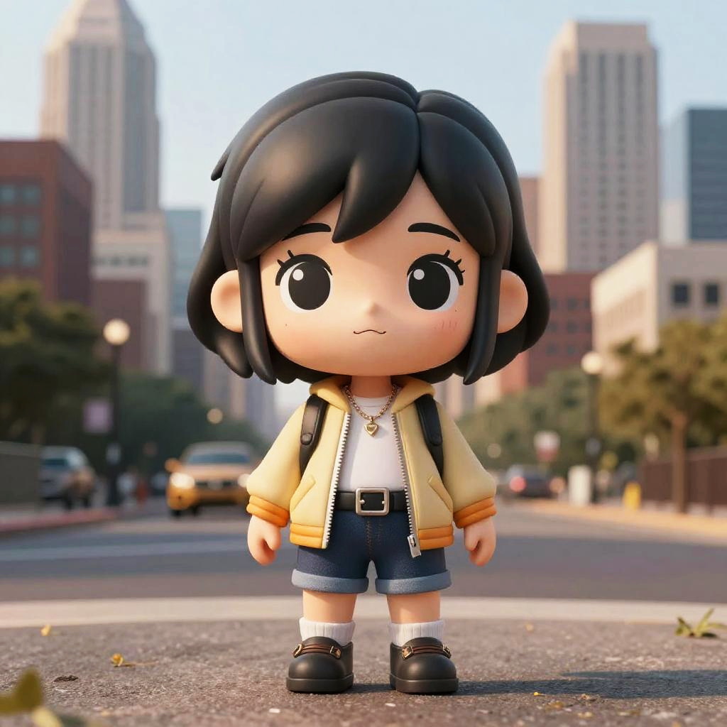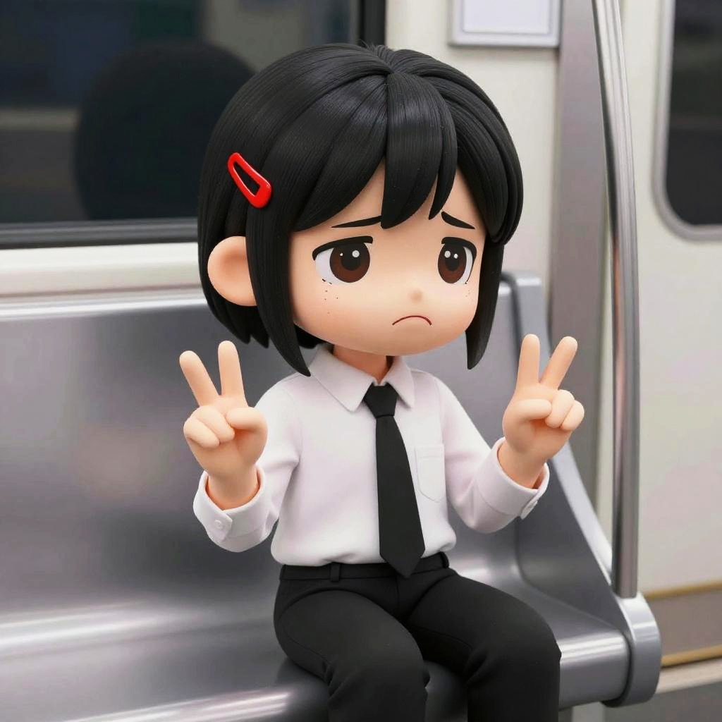 Digital anime-style doll with short black hair, red hairclip, white shirt, black tie, and pants, sitting on a subway seat, making a