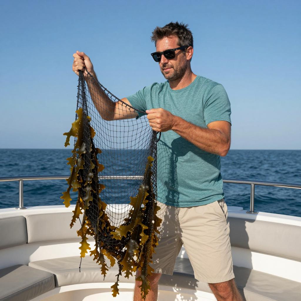 Man in a light gray t-shirt and khaki shorts standing at the wheel of a small, gray fishing boat. He has short brown hair and is looking back over his shoulder. Blue ocean in the background. Boat has a yellow canopy and metal frame. Bright sunlight.