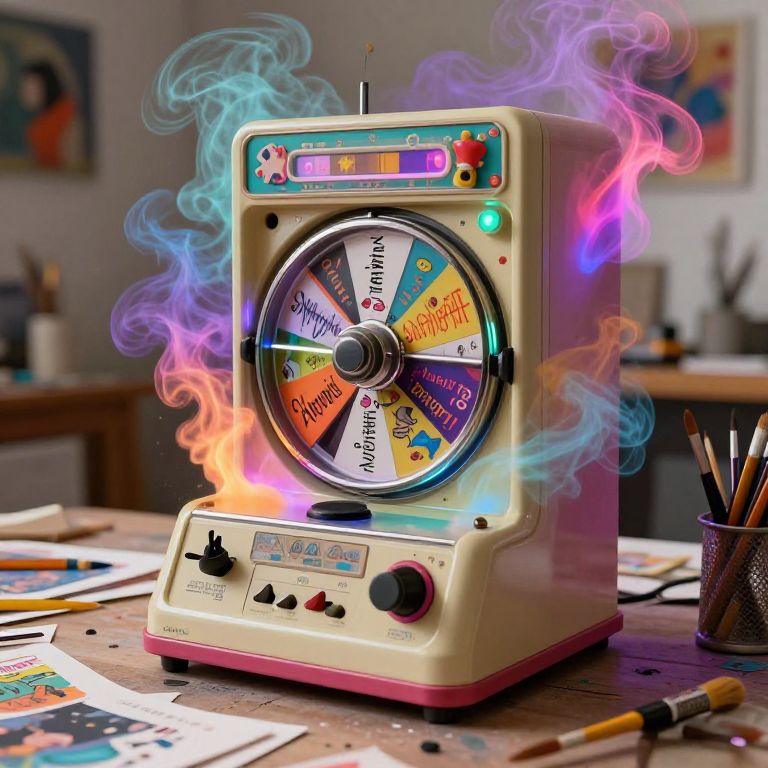 A surreal draw idea generator machine combining vintage and futuristic elements, with spinning reels displaying random art prompts, colorful smoke and light effects swirling around, set in an art studio with scattered papers and brushes, vibrant and imaginative style