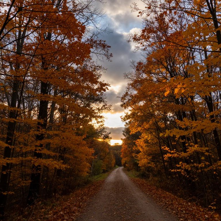 The image captures a serene autumnal scene with a winding dirt path cutting through a forested area. The path, lined with trees bearing golden and orange leaves, leads the eye towards a distant horizon where the sun casts a warm, golden glow. The sky above is a dramatic mix of dark clouds and patches of bright sunlight, creating a striking contrast. The trees on either side of the path are tall and leafy, their branches reaching out as if to frame the path. The ground is covered with a layer of fallen leaves, adding texture and depth to the scene. The overall composition is balanced, with the path serving as a central axis that draws the viewer's gaze towards the vanishing point in the distance. The interplay of light and shadow, combined with the rich autumn colors, creates a sense of tranquility and natural beauty.