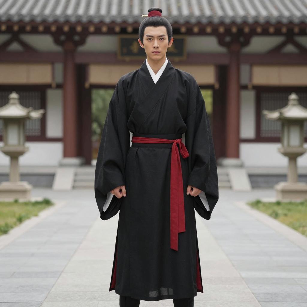 A young man dressed in traditional Asian attire stands confidently in a historic courtyard with classical architecture in the background. His black robe accented with a red sash highlights the tasteful and authentic costume work, reflecting a cultural or period style.
