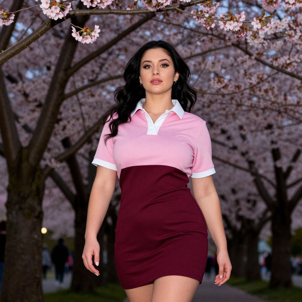 A Pear-shaped body type woman in a color-blocked pink and maroon rugby-style polo dress, featuring a traditional collar and short cuffed sleeves, enjoys an evening stroll in a cherry blossom grove, surrounded by blooming trees. The scene is captured in an oversaturated film style, enhancing the vibrant colors of the blossoms as she admires the beauty around her. Sexy. Pretty face and beаutiful eyes. Big breasts