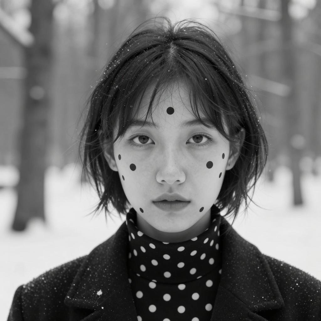 Black and white closeup portrait of a young Asian woman with short hair and black polkadot patterns on her face and clothing. She is wearing a dark coat over a polkadot turtleneck, standing in a snowy forest with blurred barren trees in the background. The image features an artistic, high-fashion style with a frosty, surreal atmosphere.