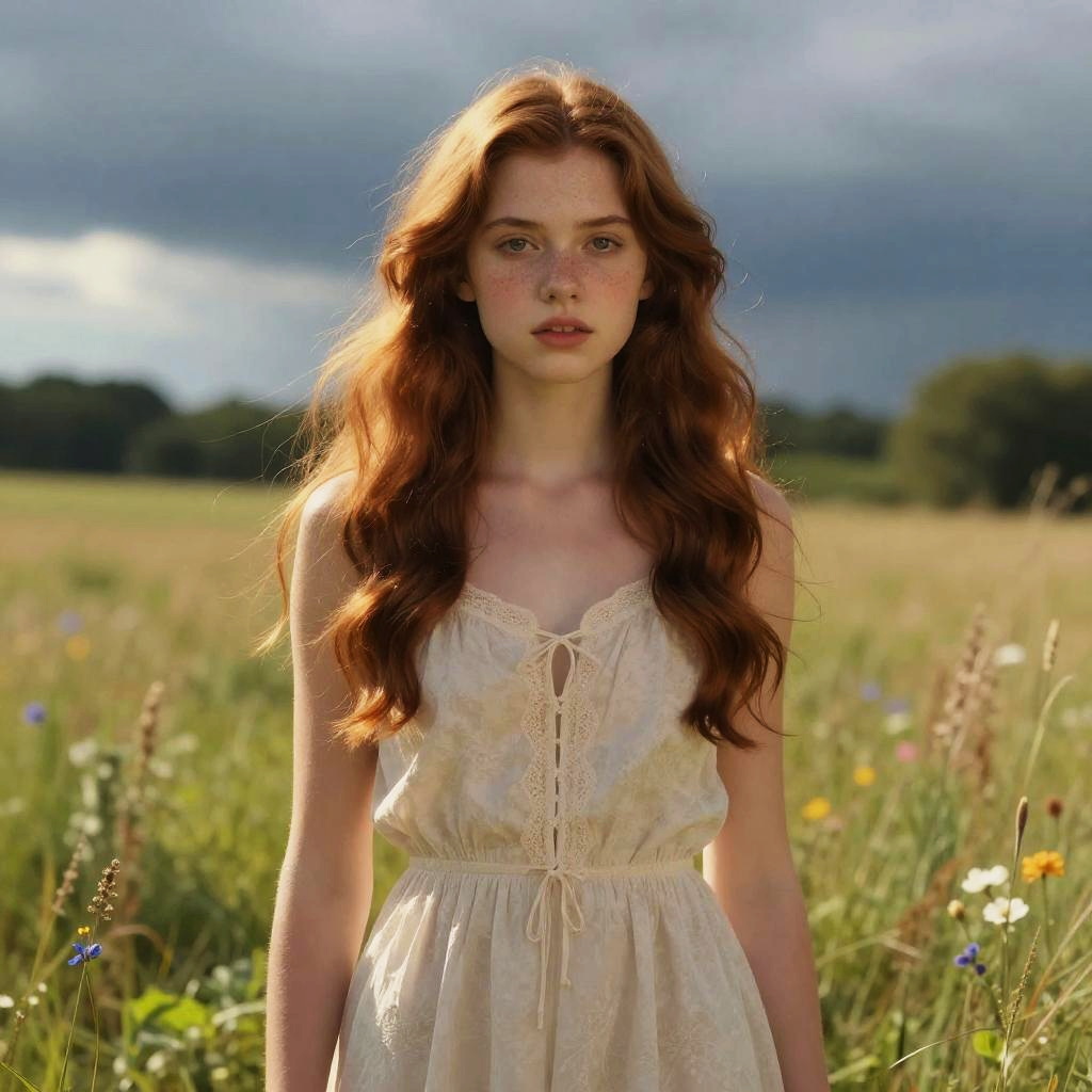 Realistic photo.Exotically beautiful nymph, with shoulder-length curly light brown hair, golden eyes, intricate diamond face, bosomy curvaceous physique, broad bottom, hourglass figure, wearing floral summer dress, standing in a flower-filled meadow entrance, 8k photo, film noir style, elegant lighting, detailed features, comely gaze realistic photo