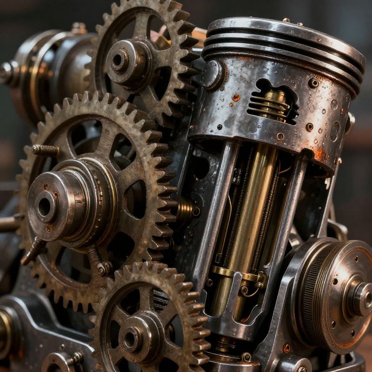 Estrutura of a complex mechanical engine with gears and pistons exposed, steampunk style, metallic textures with rust and oil stains, detailed close-up view, dramatic lighting