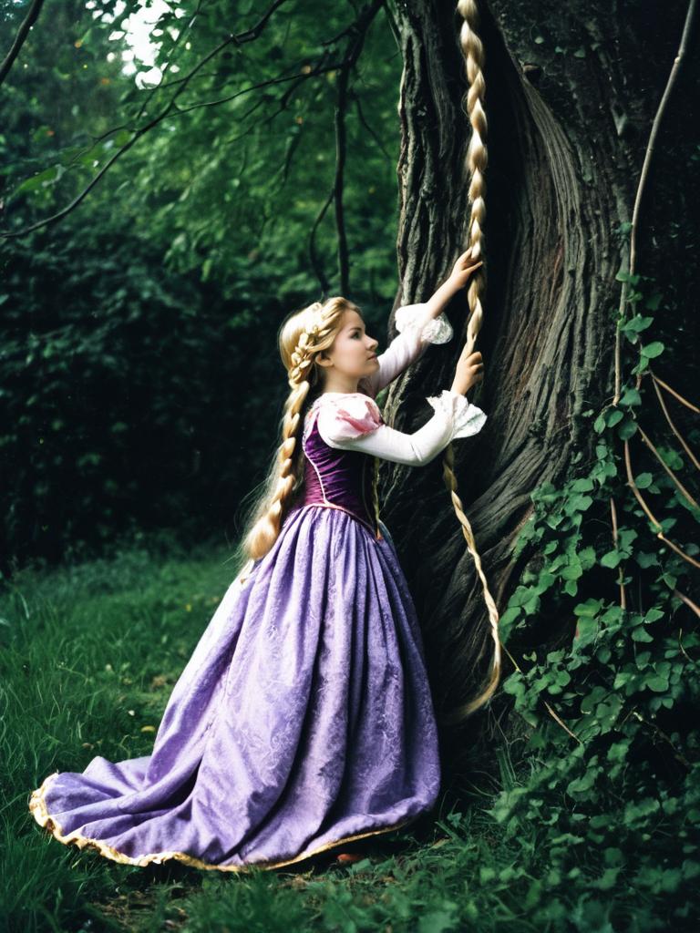 Child in Rapunzel Costume, cinematic realism, whimsical cosplay photo