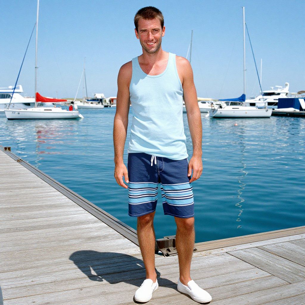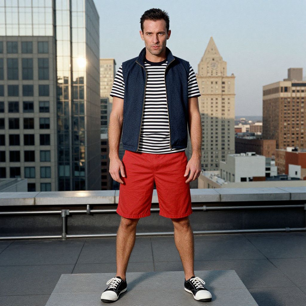A man, dark blue zip-up vest, striped black and white t-shirt, vibrant red shorts, black and white court shoes, standing on a rooftop installation, urban skyline backdrop, sunlight reflecting off glass surfaces, hand-tinted photograph, confident expression Man has masculine face and piercing eyes
