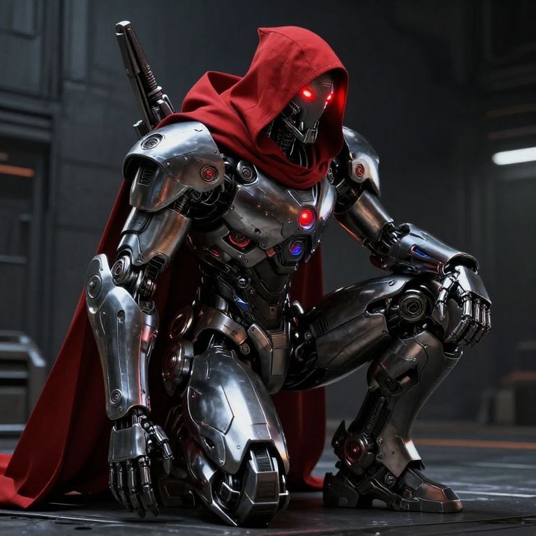 Photorealistic CGI of a robotic figure in a brown hooded cloak, leaning against a sunlit brick alleyway, arms crossed. Cyberpunk style