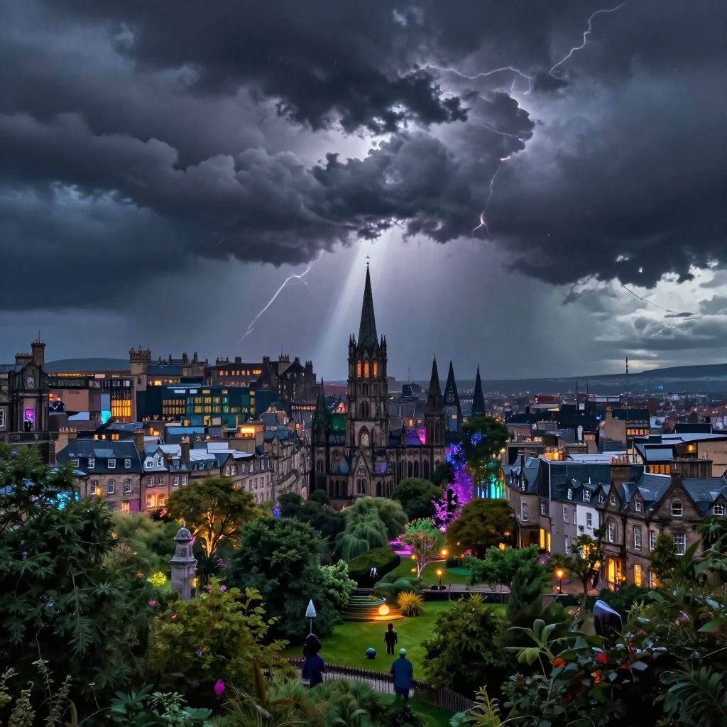 Designed by greg manchess, huang guangjian, greg rutkowski and jesper ejsing, digital art, landscape of a Moody Edinburgh, Hurricane, Masterpiece, Light, ultra high res, science fiction, sci-fi, advanced cinematic perfect light, located artistic, lush, dynamic cinematic color, colorful, enchanted