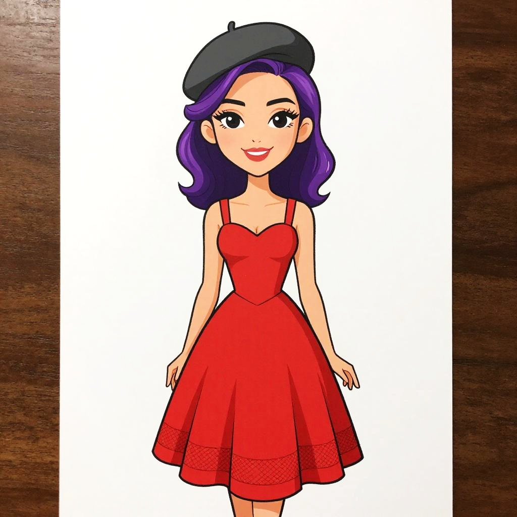 Digital cartoon illustration of a young woman with fair skin and purple, wavy hair. She wears a black beret, a red, sleeveless, strapless, A-line dress with lace detailing at the hem, and has large, expressive black eyes and a smiling mouth. Her arms rest by her sides. The background is a plain white vertical strip flanked by dark brown wooden textures on either side. The character's style is reminiscent of 1950s pin-up art, with a modern, vibrant color palette.