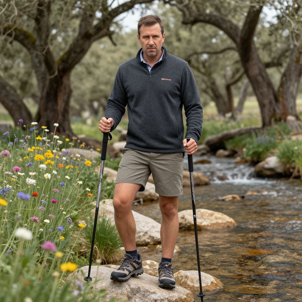A man, short-sleeve performance polo, stretchable hiking shorts, trail running shoes, charcoal fleece pullover, collapsible trekking poles, crystal-clear stream, vibrant wildflowers, ancient oaks, hand-tinted photograph, focused expression Man has masculine face and piercing eyes