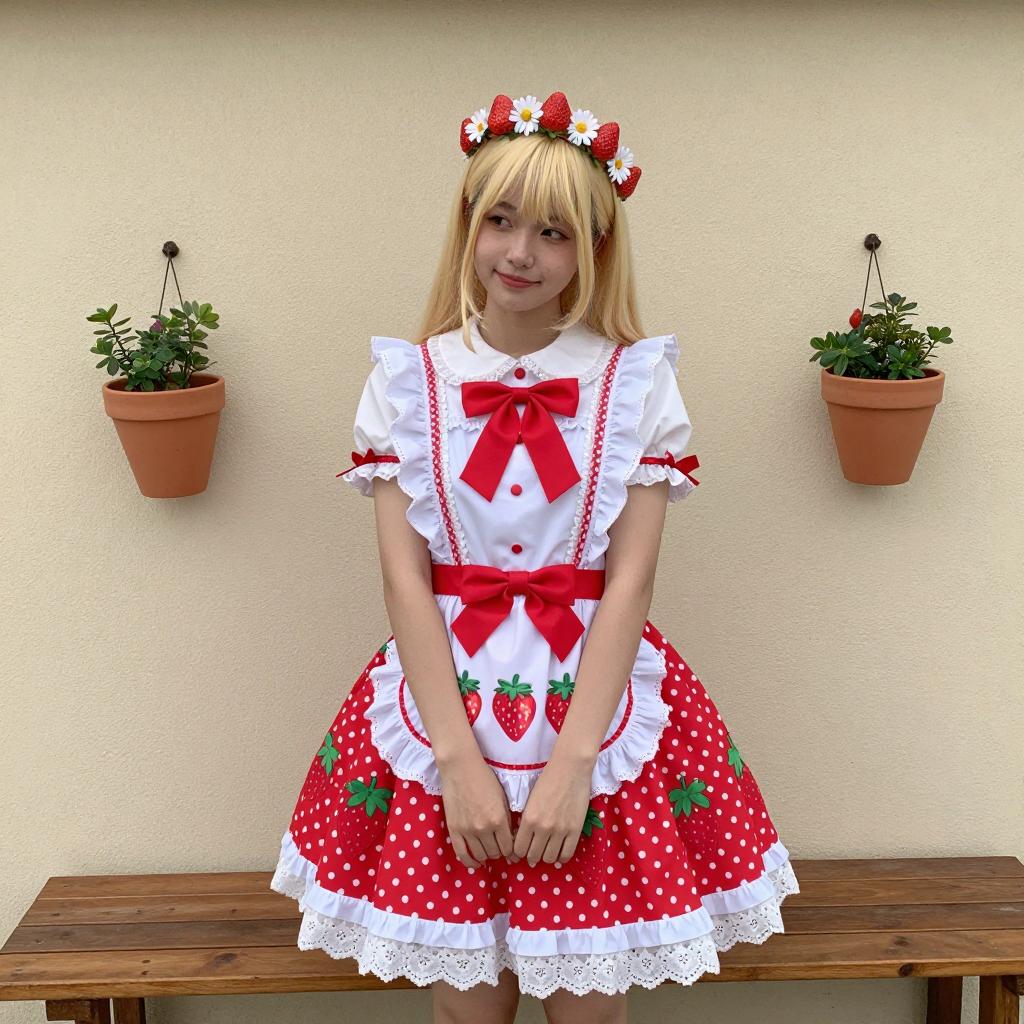 Photograph of a young woman with long blonde hair wearing a red and white strawberry-themed maid dress featuring red bows, white lace trim, and polka dot patterns. She has a floral crown with strawberries and daisies, standing outdoors against a beige wall with two terracotta hanging planters and a wooden bench. The image conveys a casual summer vibe with a soft smile and relaxed pose.