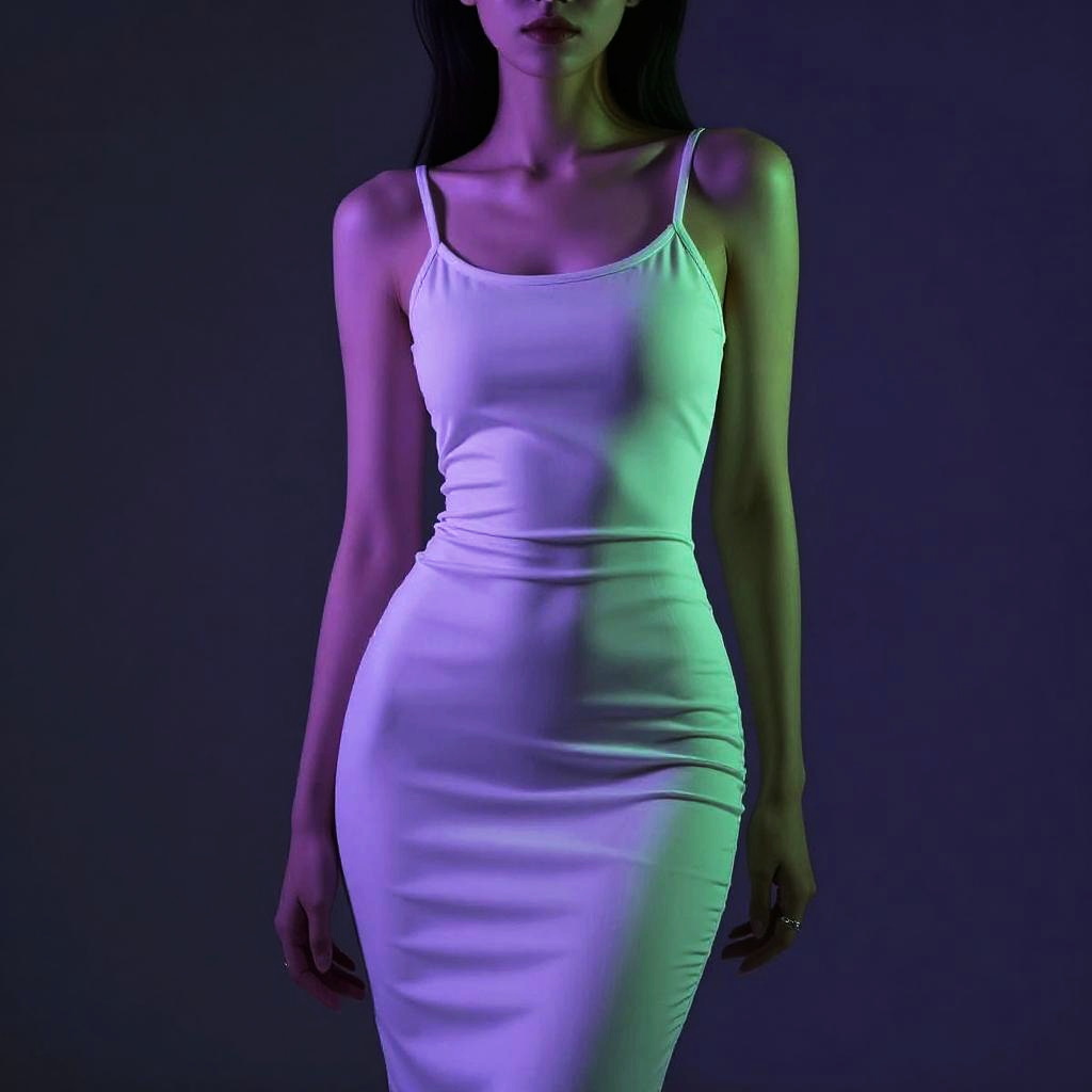 Neon tight dress glowing under city night lights, futuristic urban backdrop, sleek and shiny fabric reflecting neon signs, high detail, vibrant colors, digital art style