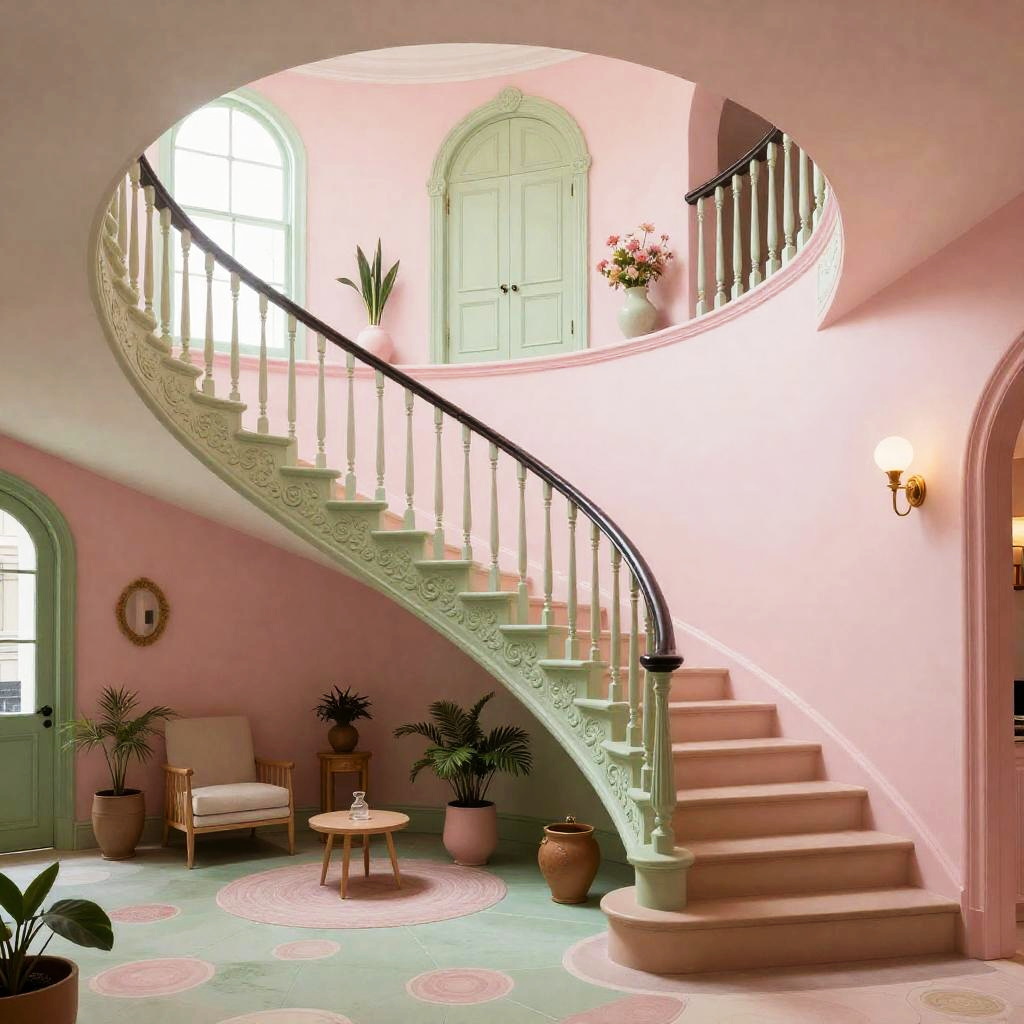Realistic photo.Chromolithograph an ornate and detailed staircase inside a building, in the style of pastel pink and green, maximalist, beautiful interiors, cozy spaces, playful installations, lively interiors realistic photo