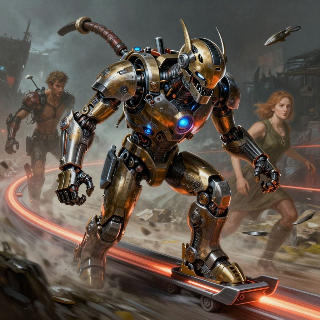 This digital artwork depicts a dynamic sci-fi battle scene. At the forefront, a humanoid robot with a metallic gold and black exoskeleton, blue glowing eyes, and sharp horns is running on a glowing red, light-trail path. Its right arm is extended forward, and its left arm is slightly back. Behind the robot, a muscular man with curly brown hair and wearing a brown leather vest and pants is sprinting. To the right, a red-haired woman in a green tank top and brown shorts is also running. The background is a dark, smoky urban battlefield with futuristic buildings and debris. The image has a high-energy, action-packed style with vivid colors and intricate details.