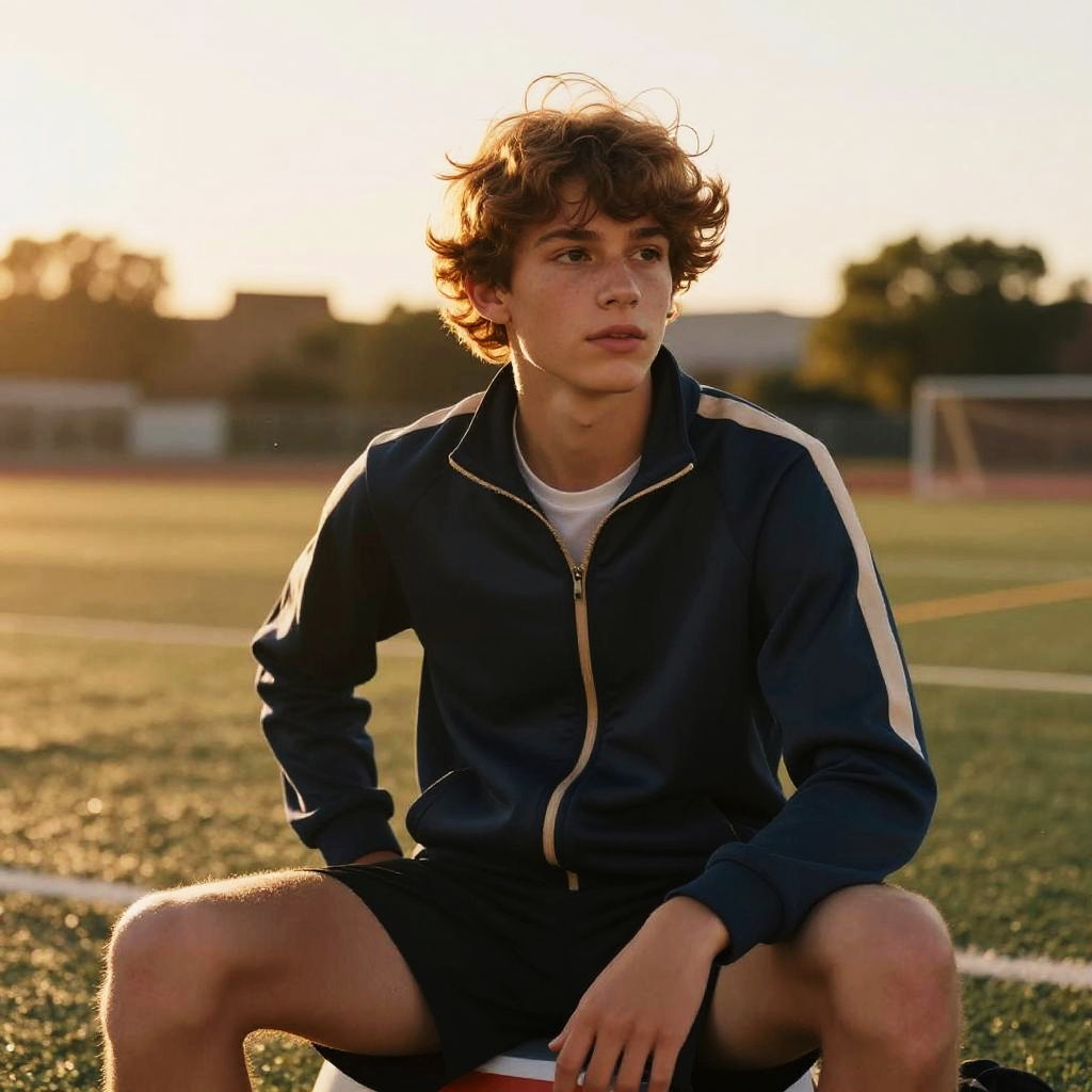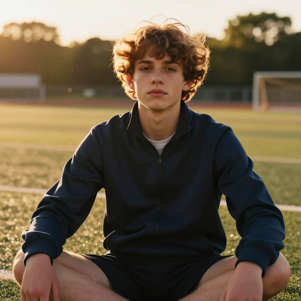(masterpiece:1.1), best quality, (photorealistic:1.2), hyperrealistic, award-winning portrait of teenage boy, curly chestnut hair, focused gaze, upper body, expressive eyes, slim wai BREAK 1.1, wide hips:1.1, athletic-curvy build, wind-swept hair, sitting in sports field under warm twilight, wearing tracksuit jacket and running shorts, golden hour glow, dappled light, soft particles in the air, 8k, highly detailed, broad lighting, chromatic aberration, subtle film grain, ray tracing, octane render, soft bloom