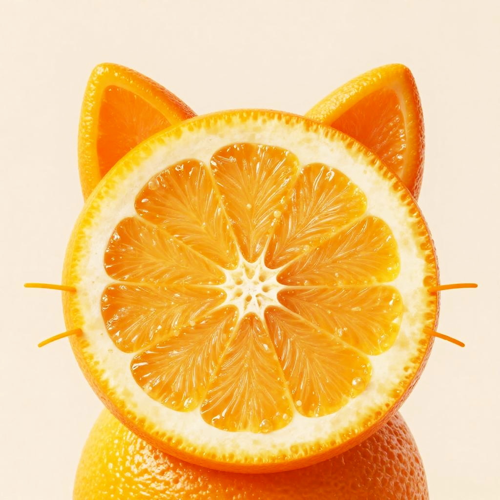 Cat made of orange slices, surreal artwork, bright orange tones, glossy fruit texture, whimsical style, soft shadows, studio lighting, close-up detail