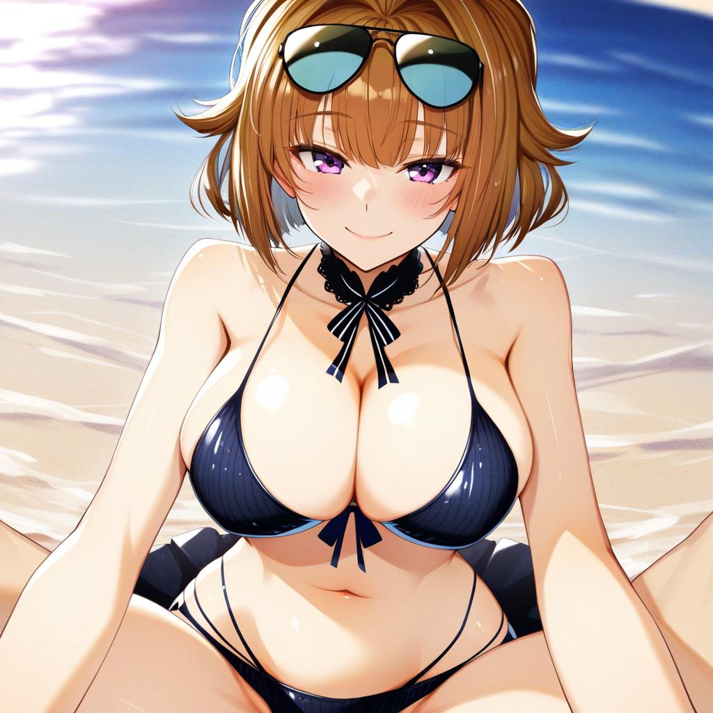 Grizzly mkv (girls' frontline), girls' frontline, 1girl, purple eyes, eyewear on head, brown hair, short hair, large breasts, cleavage, navel, sunglasses, by artist cluseller, illustrious