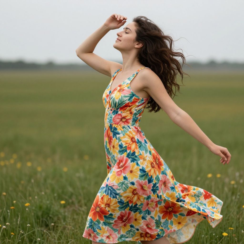 Embracing the gentle caress of a summer breeze, a woman in a vibrant floral gown dances between serenity and freedom, her laughter echoing the timeless beauty of nature’s embrace.