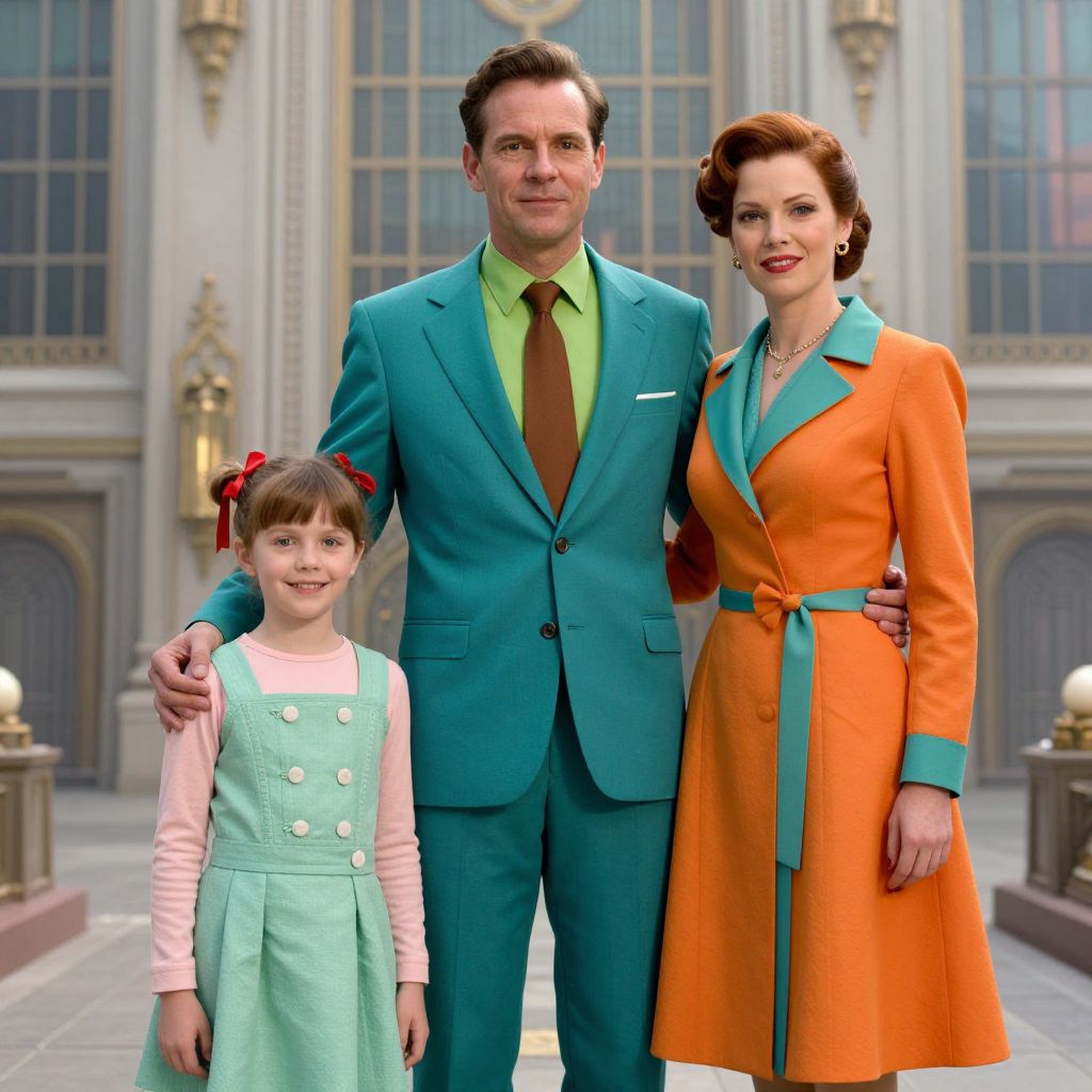 In a 30th-century cityscape, a family portrait of biomechanical androgynous humans stands out with vintage colors and a toned photo effect. The family, composed of a man, a woman, and a child, is dressed in vibrant teal and orange hues, with light pink accents adding a touch of warmth. The man, positioned centrally, wears a teal suit with a green shirt and a brown tie, his arm around the child. The woman, to his right, dons an orange coat with teal accents, her hair styled in an elegant updo. The child, to the left, is clad in a light green outfit with white buttons, her hair adorned with red ribbons. The background features a grand, ornate building with large windows, creating a sense of depth and context for the family's urban setting. The overall composition is balanced, with the family members aligned in a triangular formation, creating a harmonious and dynamic visual narrative.