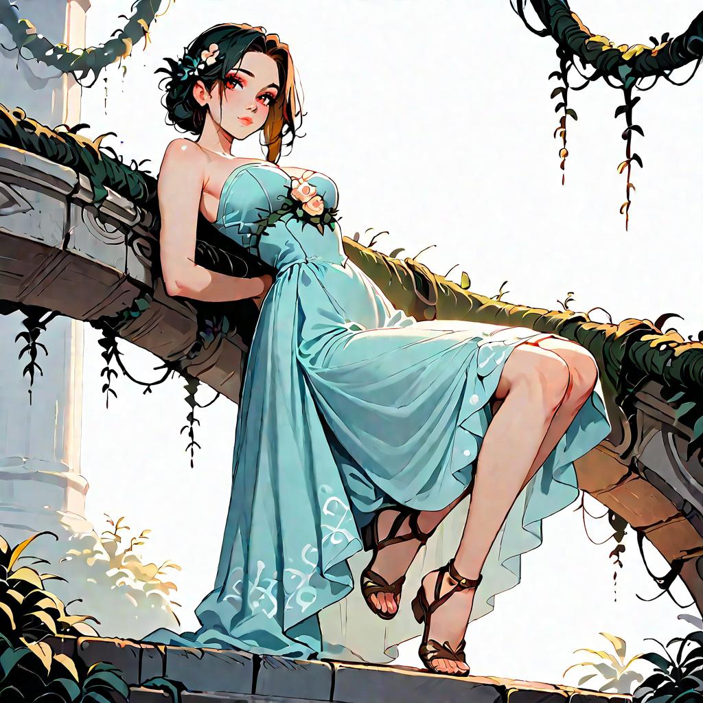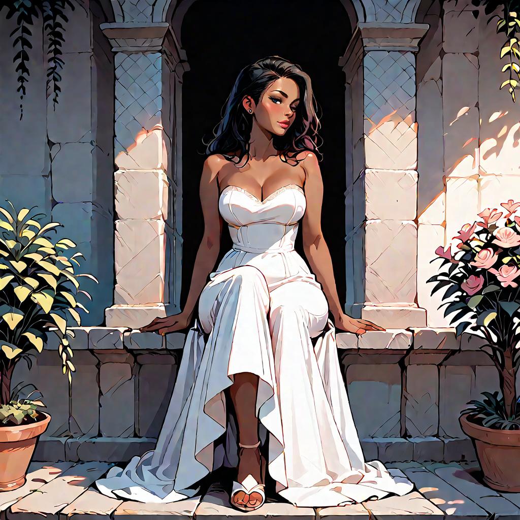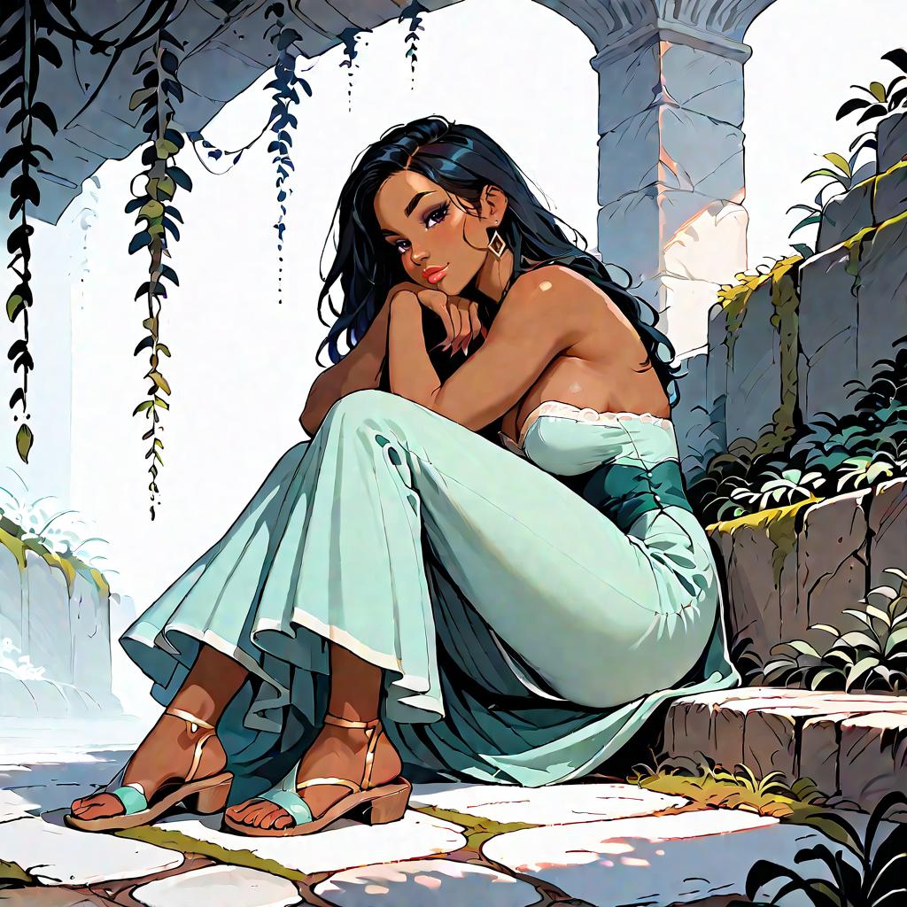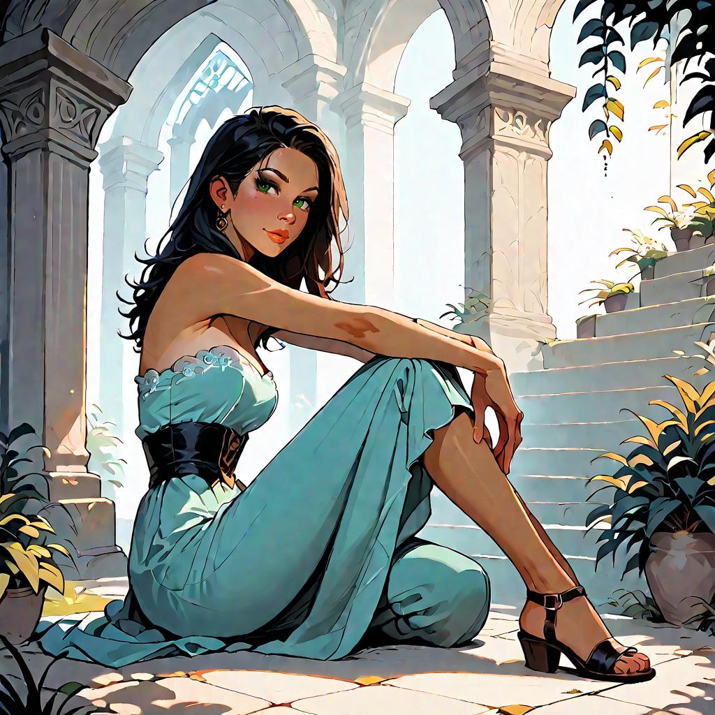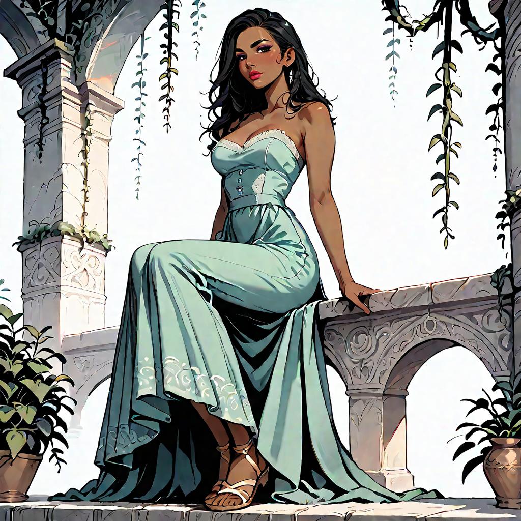Illustration of a woman with olive skin and straight dark hair wearing a strapless smocked-bodice tiered maxi dress in light blue with lace-trimmed hem and a high side slit. She is seated on a whitewashed Mediterranean-style stone staircase adorned with climbing green vines, wearing minimalist strappy sandals. The setting features soft natural daylight and detailed architectural elements.