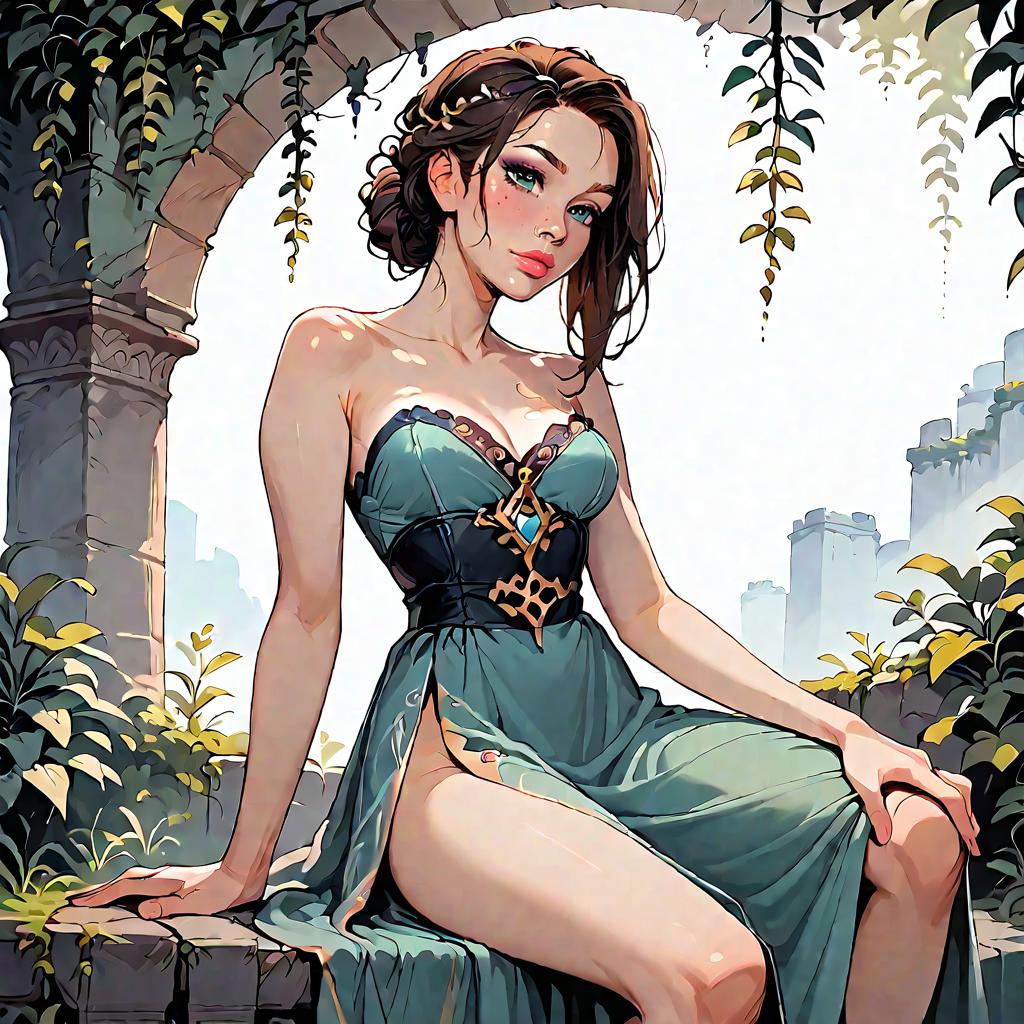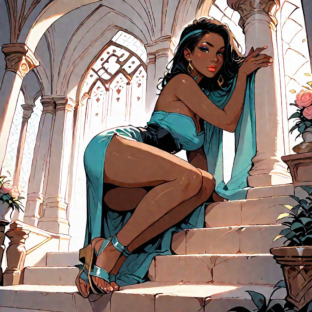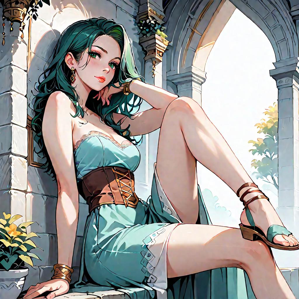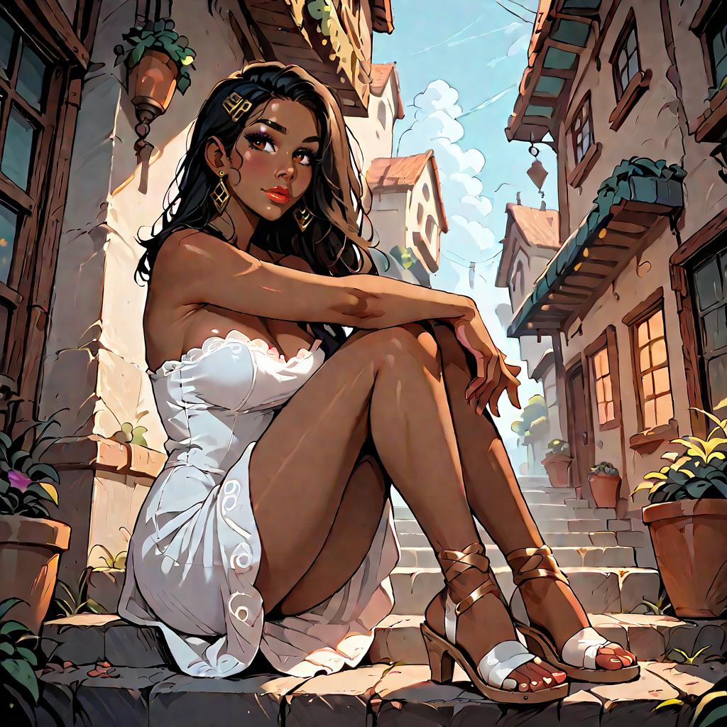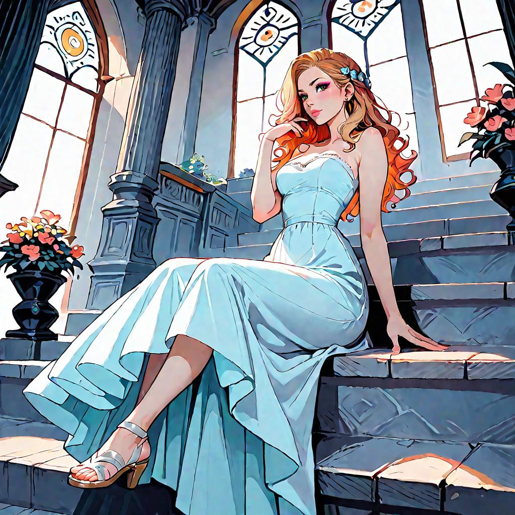 Illustration of a woman with olive skin and straight dark hair wearing a strapless smocked-bodice tiered maxi dress in light blue with lace-trimmed hem and a high side slit. She is seated on a whitewashed Mediterranean-style stone staircase adorned with climbing green vines, wearing minimalist strappy sandals. The setting features soft natural daylight and detailed architectural elements.