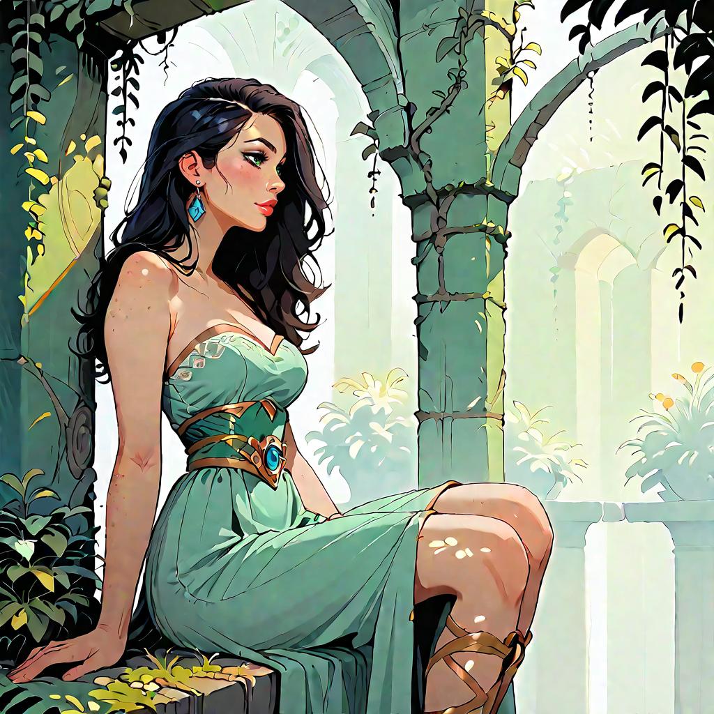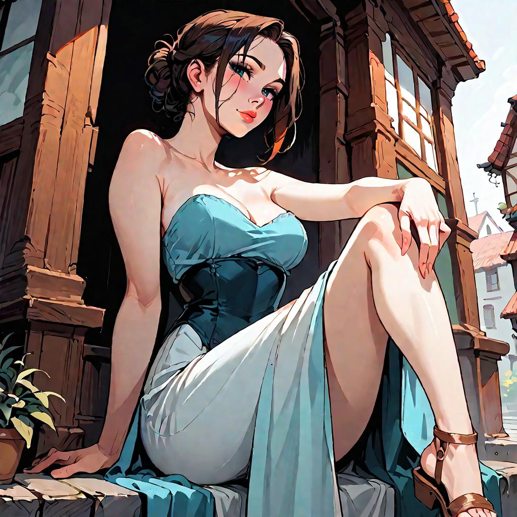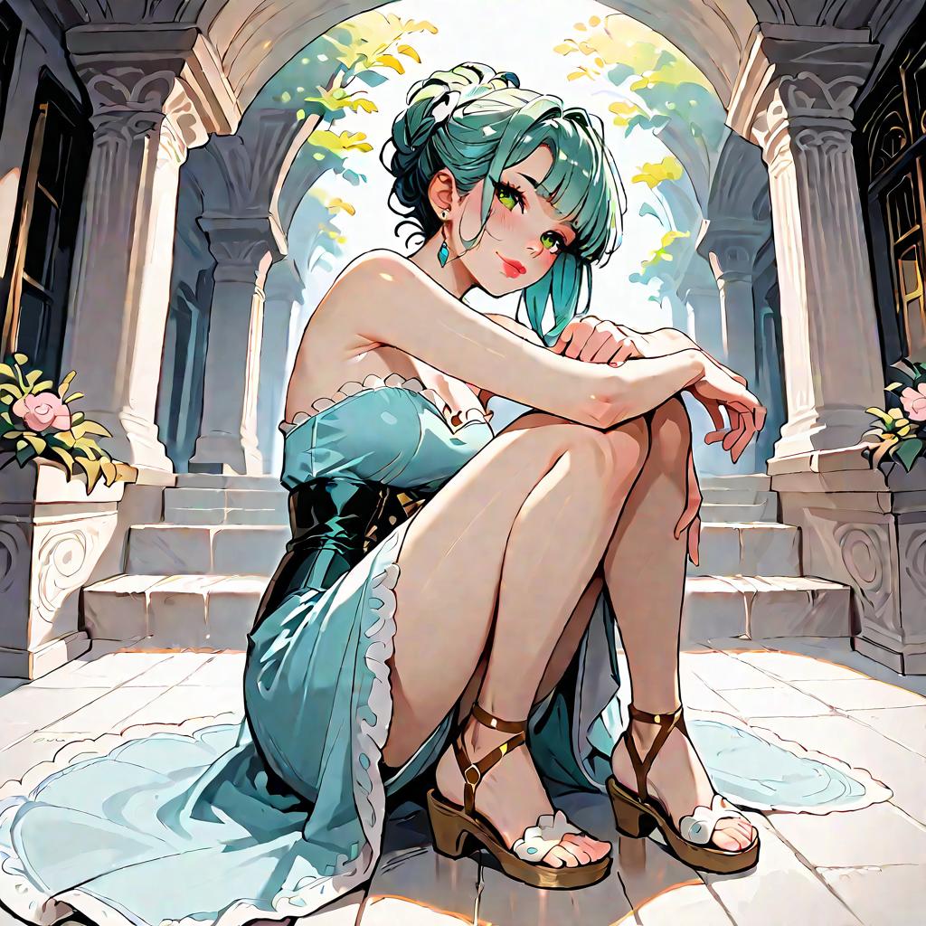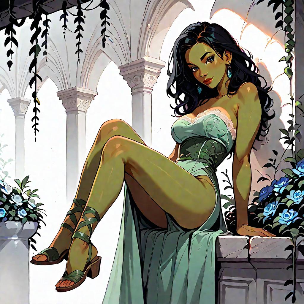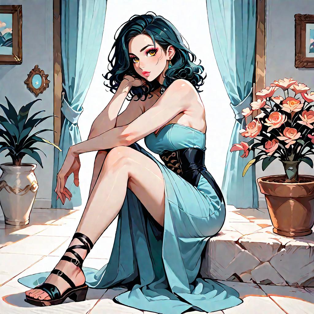 Illustration of a woman with olive skin and straight dark hair wearing a strapless smocked-bodice tiered maxi dress in light blue with lace-trimmed hem and a high side slit. She is seated on a whitewashed Mediterranean-style stone staircase adorned with climbing green vines, wearing minimalist strappy sandals. The setting features soft natural daylight and detailed architectural elements.