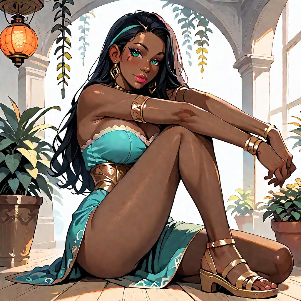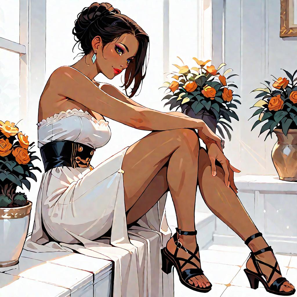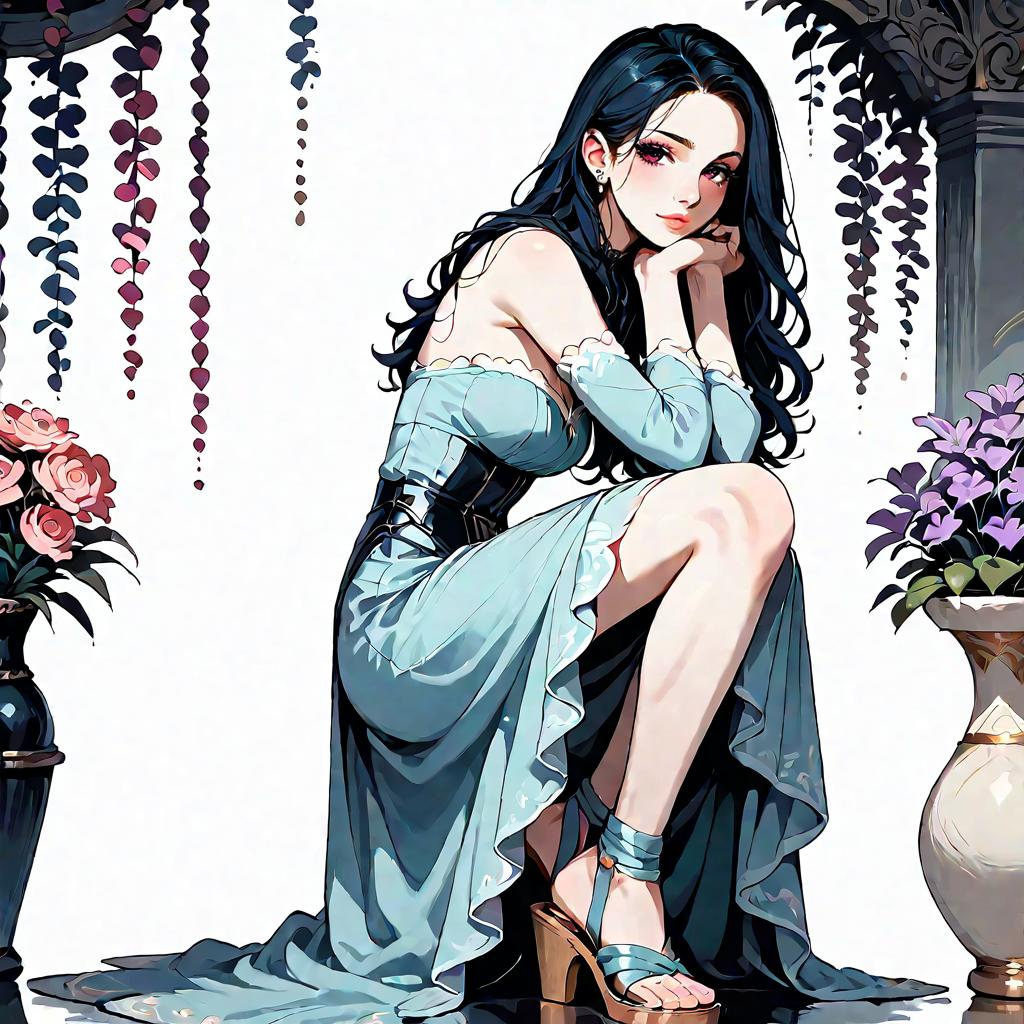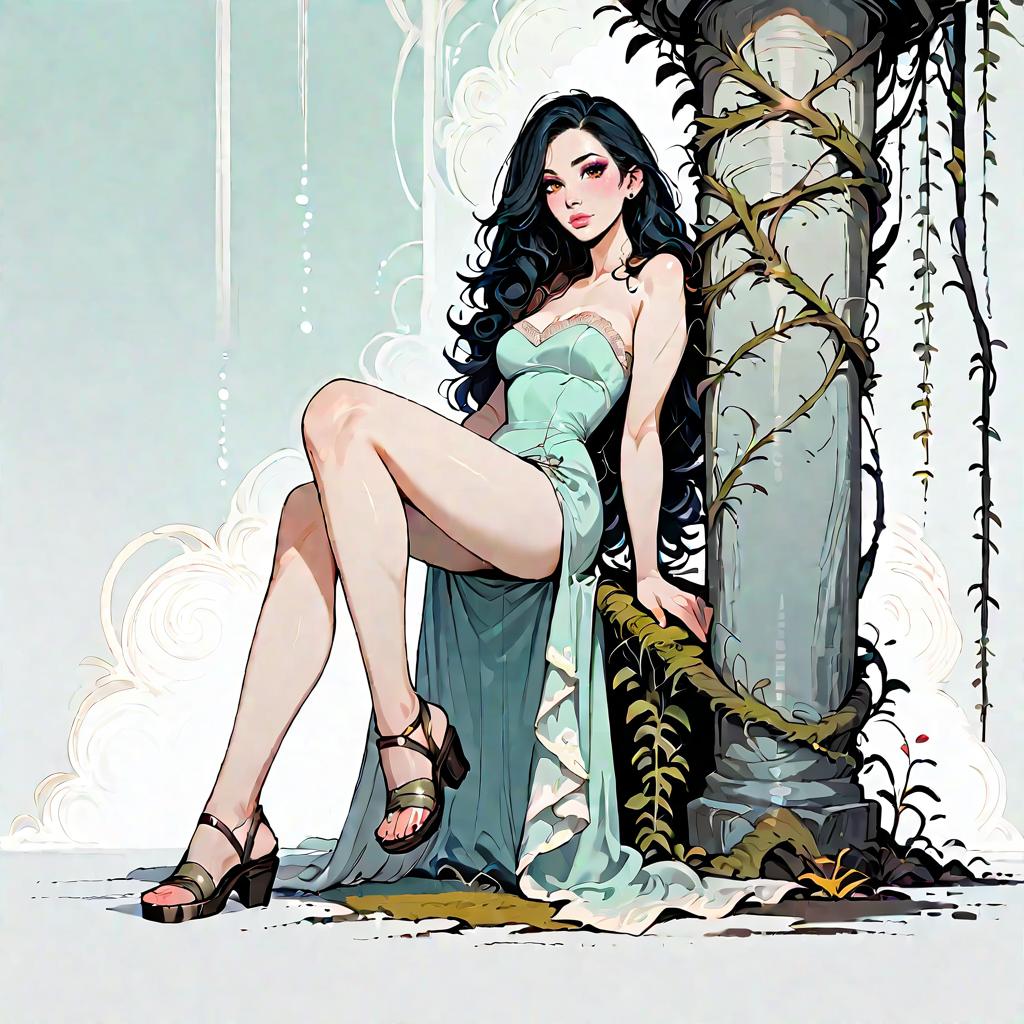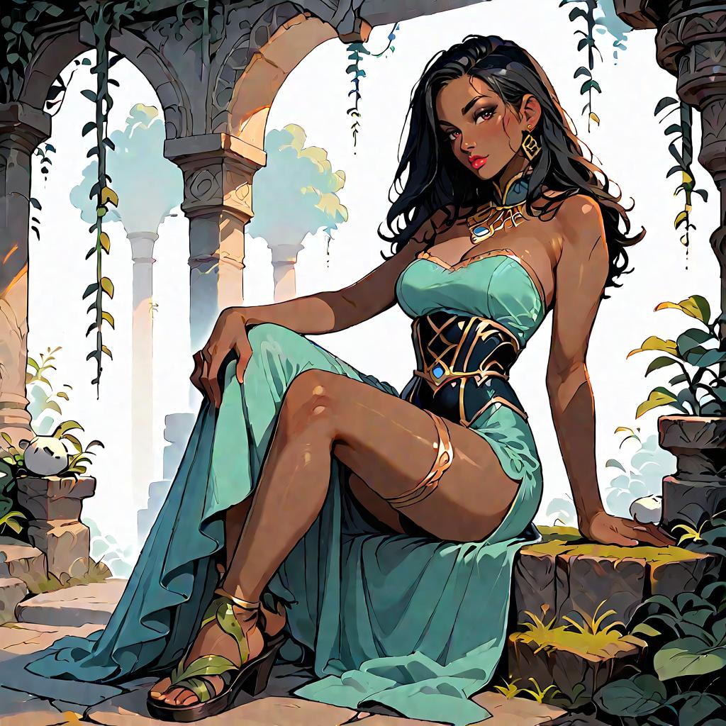 Illustration of a woman with olive skin and straight dark hair wearing a strapless smocked-bodice tiered maxi dress in light blue with lace-trimmed hem and a high side slit. She is seated on a whitewashed Mediterranean-style stone staircase adorned with climbing green vines, wearing minimalist strappy sandals. The setting features soft natural daylight and detailed architectural elements.